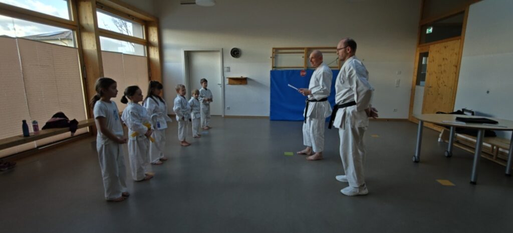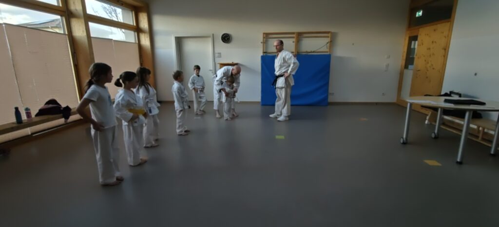 Der Prüfer Walter Meder sorgte für eine angenehme, aber zugleich konzentrierte Atmosphäre: einfühlsam im Umgang mit den Kindern und dennoch klar in der Bewertung. So konnten alle Prüflinge ihr Können optimal abrufen. Ganz nebenbei zeigte sich auch: Selbst ein Prüfer mit dem 5. Dan greift ab und zu noch zum Gürtelknoten – und sorgt dafür, dass auch bei unseren Kleinsten alles perfekt sitzt.